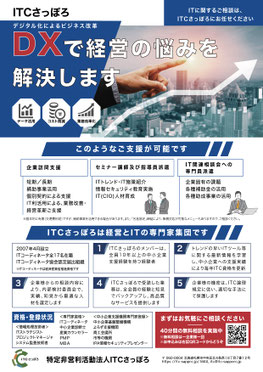 特定非営利活動法人ITCさっぽろは、札幌圏の中小企業に対し、経営戦略~情報化計画~調達~効果測定を一貫して提供できるITコーディネータを組織し、信頼され、実効性のあるサービスを提供することを目的として設立いたしました。
